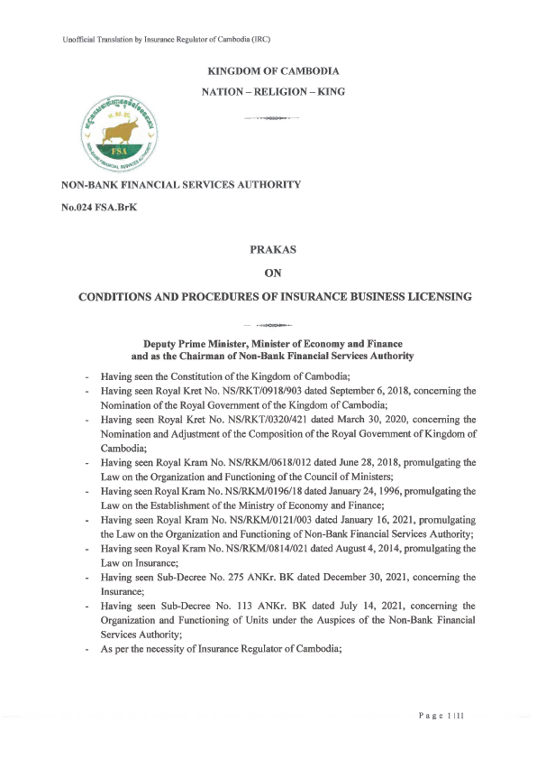 Prakas-060 on the conditions and procedures for granting insurance business support services licenses